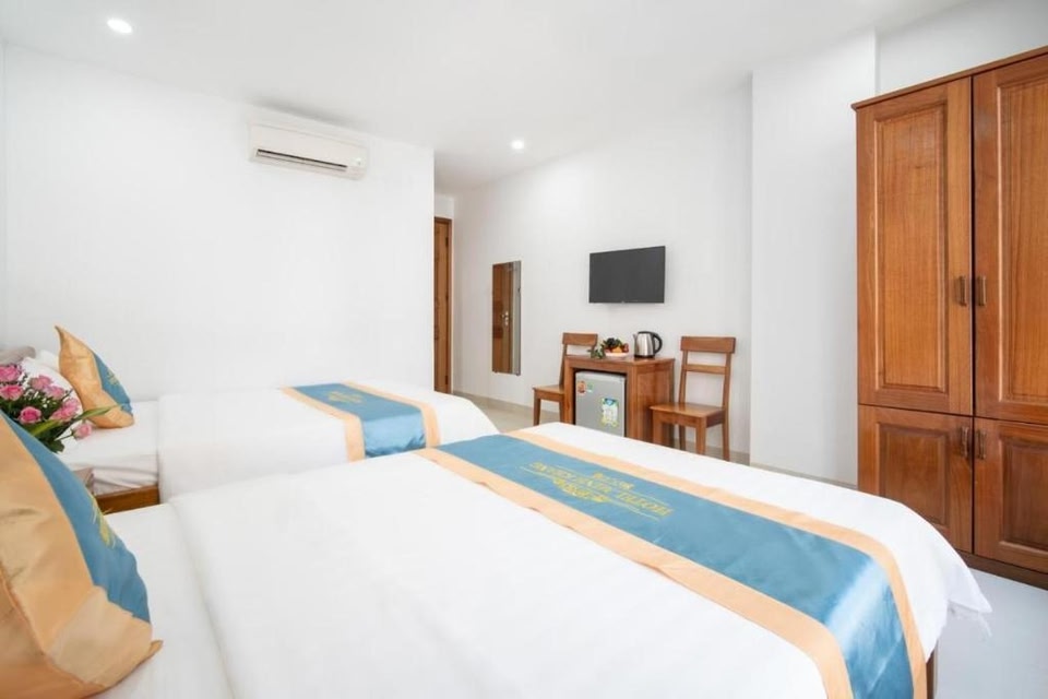 Mặt Trời Tím Hotel offers top-notch services and amenities, ensuring guests experience utmost comfort. Share your photos and respond to emails at your convenience, thanks to the free Wi-Fi internet access offered by hotel. Should you require transportation to or from the airport, hotel is able to organize it prior to your arrival date.Taxi and shuttle offerings at the hotel simplify arranging your excursions, explorations, and additional activities in Da Nang.Visitors can take advantage of complimentary parking directly at the hotel. Reception services such as concierge service, express check-in or check-out and luggage storage are available to accommodate your requirements.Should you desire access to the top entertainment in the city, assistance can be provided by the hotel's ticket service. Traveling with minimal luggage is achievable at Mặt Trời Tím Hotel due to the hotel's laundry service ensuring your garments stay fresh. Room amenities like 24-hour room service, room service and daily housekeeping contribute to making a perfect selection for your stay.The hotel maintains a completely smoke-free zone, providing a breathable atmosphere.Smoking is limited to specified smoking zones.Each accommodation at Mặt Trời Tím Hotel is thoughtfully created and adorned to provide visitors with a comfortable, home-like atmosphere. In certain rooms, the hotel offers linen service, blackout curtains and air conditioning for guest convenience and satisfaction.In select rooms, guests at the hotel can enjoy top-notch in-room entertainment with television and cable TV available for their convenience.Rest assured, in a few chosen rooms, you will find the convenience of a refrigerator, bottled water and mini bar at your disposal.Mặt Trời Tím Hotel offers a hair dryer, toiletries, bathrobes and towels in the restrooms of specific accommodations. Mặt Trời Tím Hotel provides a superb assortment of leisure amenities for guests to enjoy. Make certain to allocate time for discovering the shoreline, easily reachable right from the hotel.